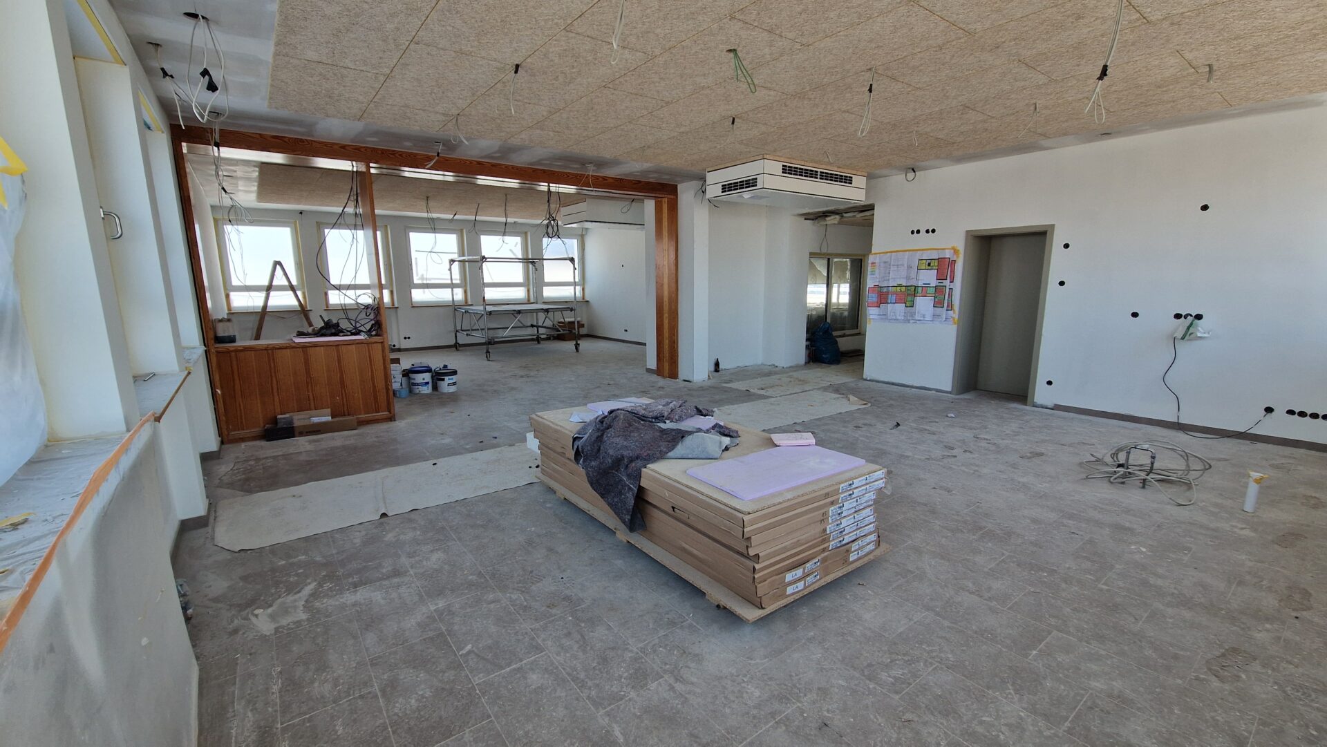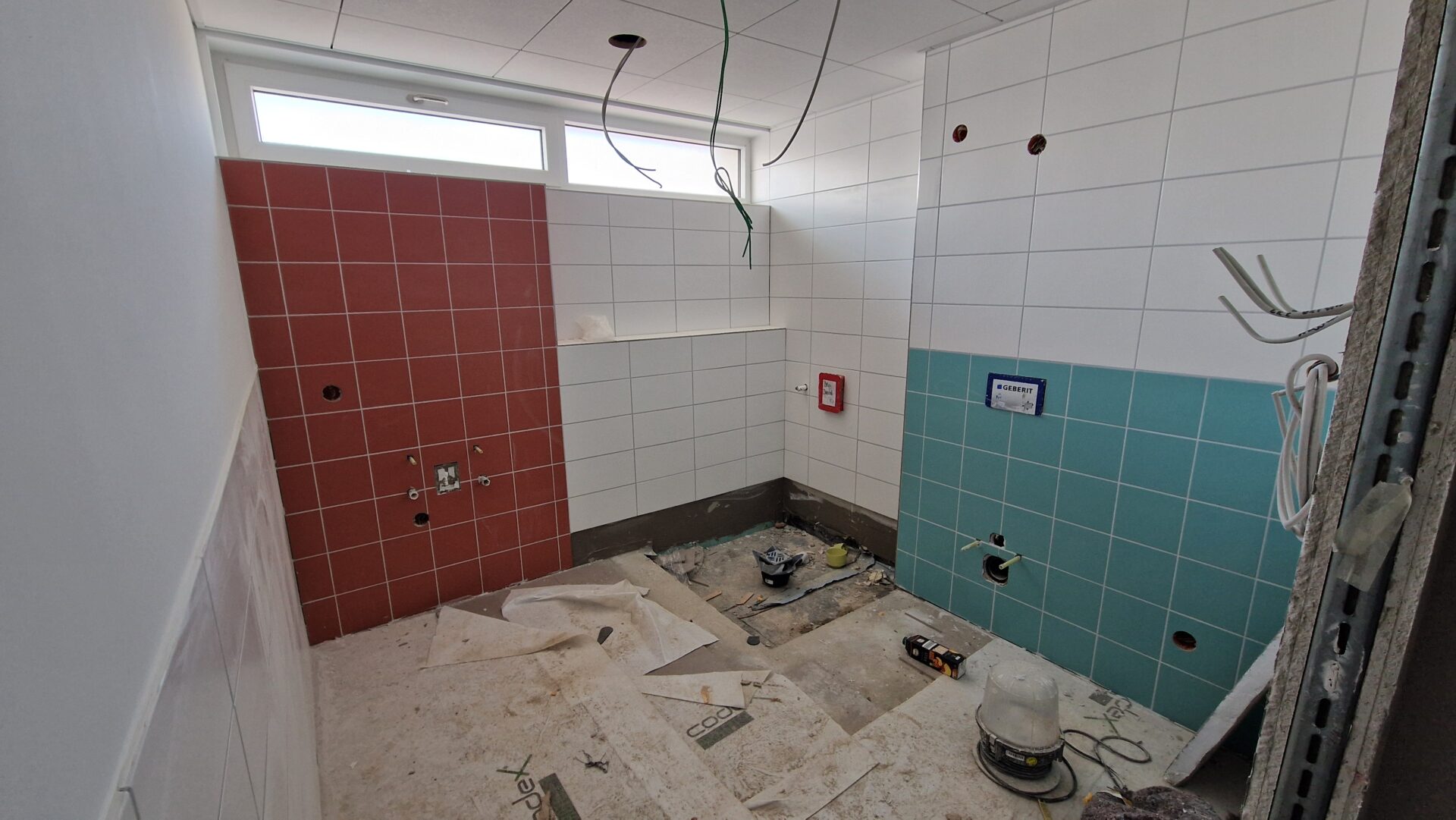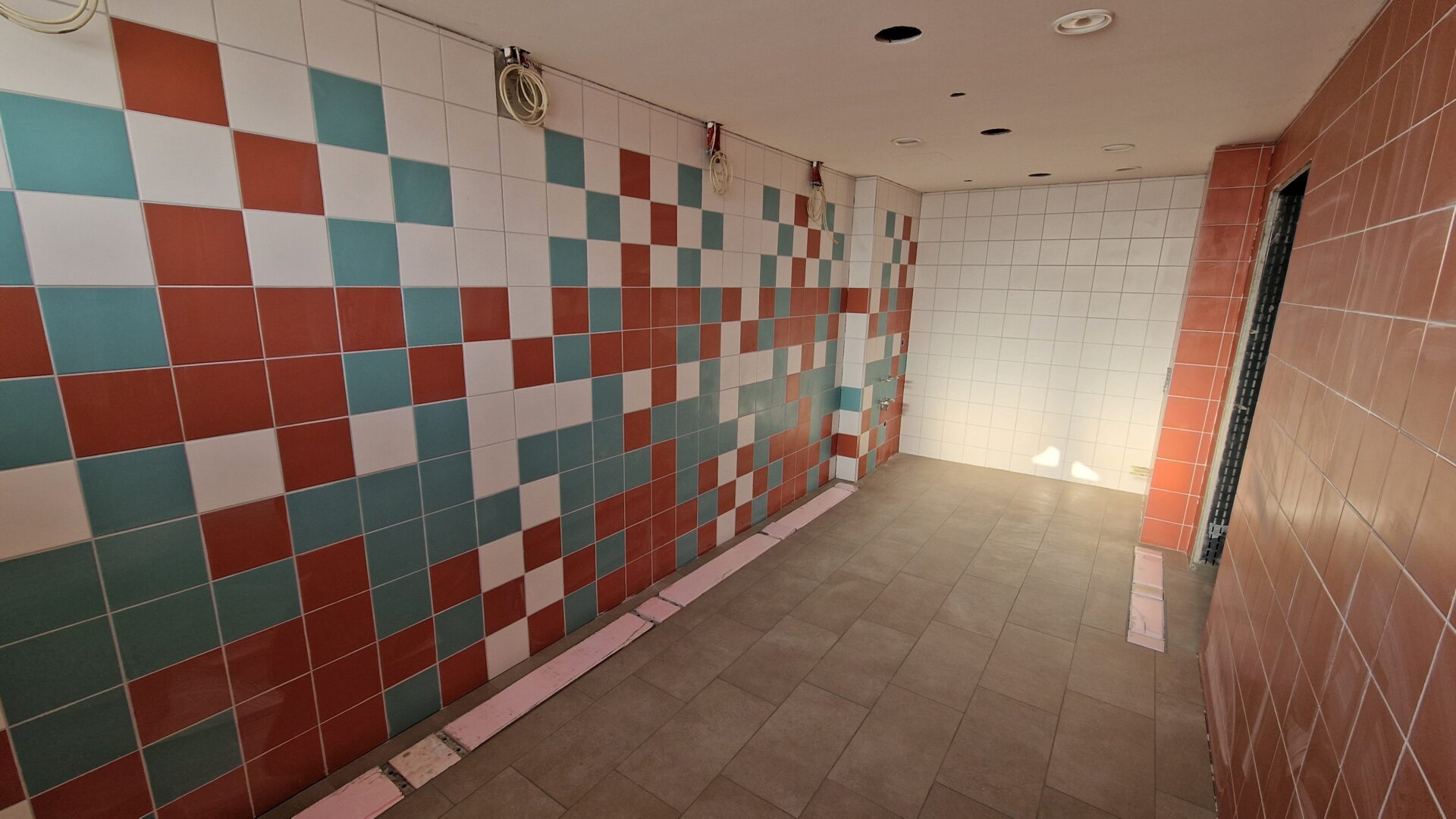 Der Innenausbau schreitet ebenfalls voran. Der Trockenbau bei den Decken ist nahezu abgeschlossen, der Innenputz wurde aufgebracht und viele Wandflächen sind bereits gestrichen. In den Sanitärbereichen arbeiten derzeit die Fliesenleger, zahlreiche Flächen sind bereits verlegt. Der Schreiner hat zudem rund die Hälfte der neuen Innen-Holztüren eingebaut – ein weiterer sichtbarer Schritt in Richtung Fertigstellung.