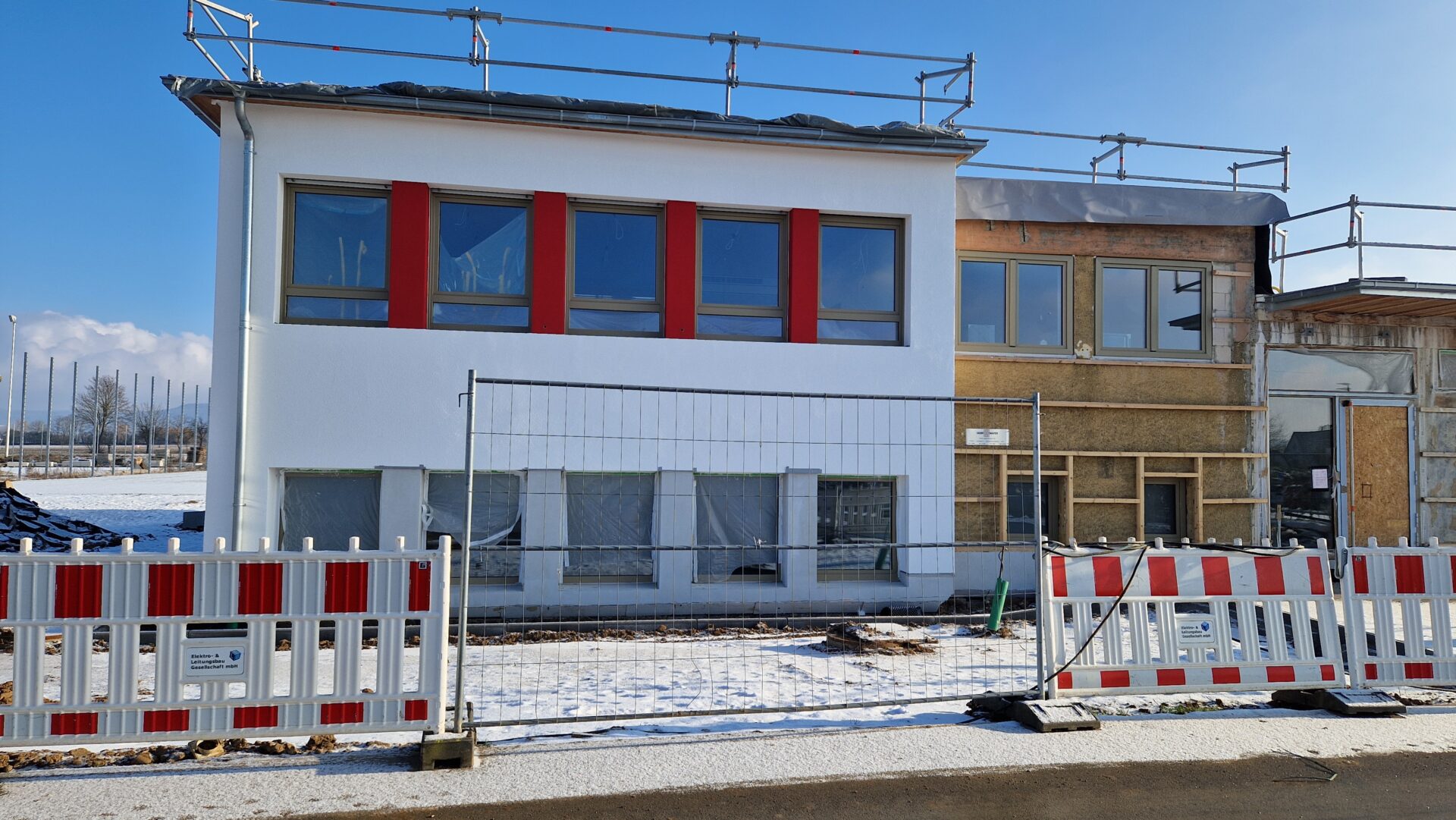 Witterungsbedingt müssen die Arbeiten an den Außenanlagen derzeit noch pausieren. Auch die geplante neue Heizzentrale in Fertigbauweise kann erst nach Abschluss der Fundamentarbeiten an den hinteren Garagen in der Nähe der Kita „Sportfeldspatzen“ aufgestellt werden.