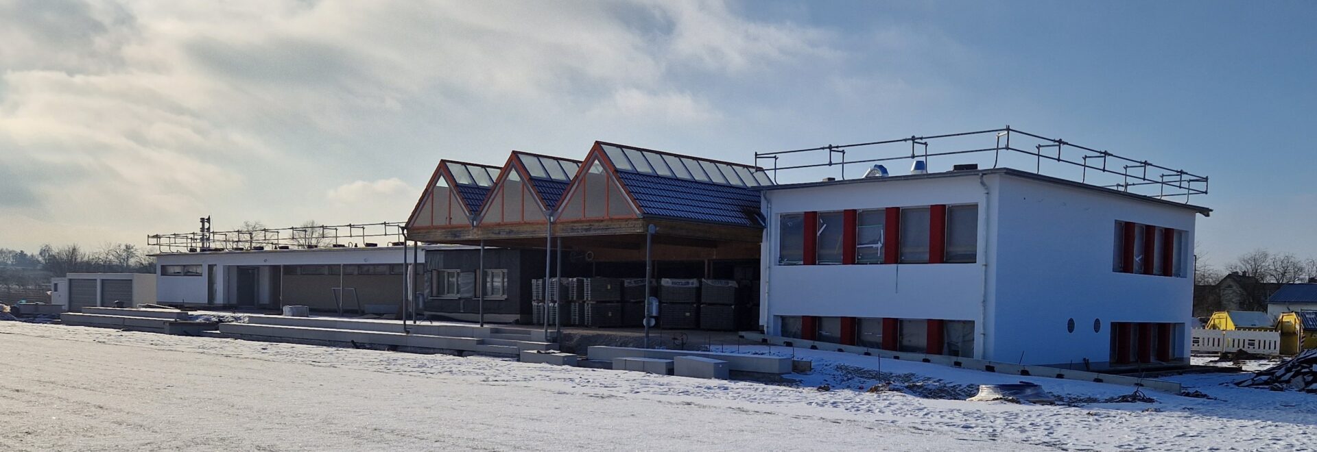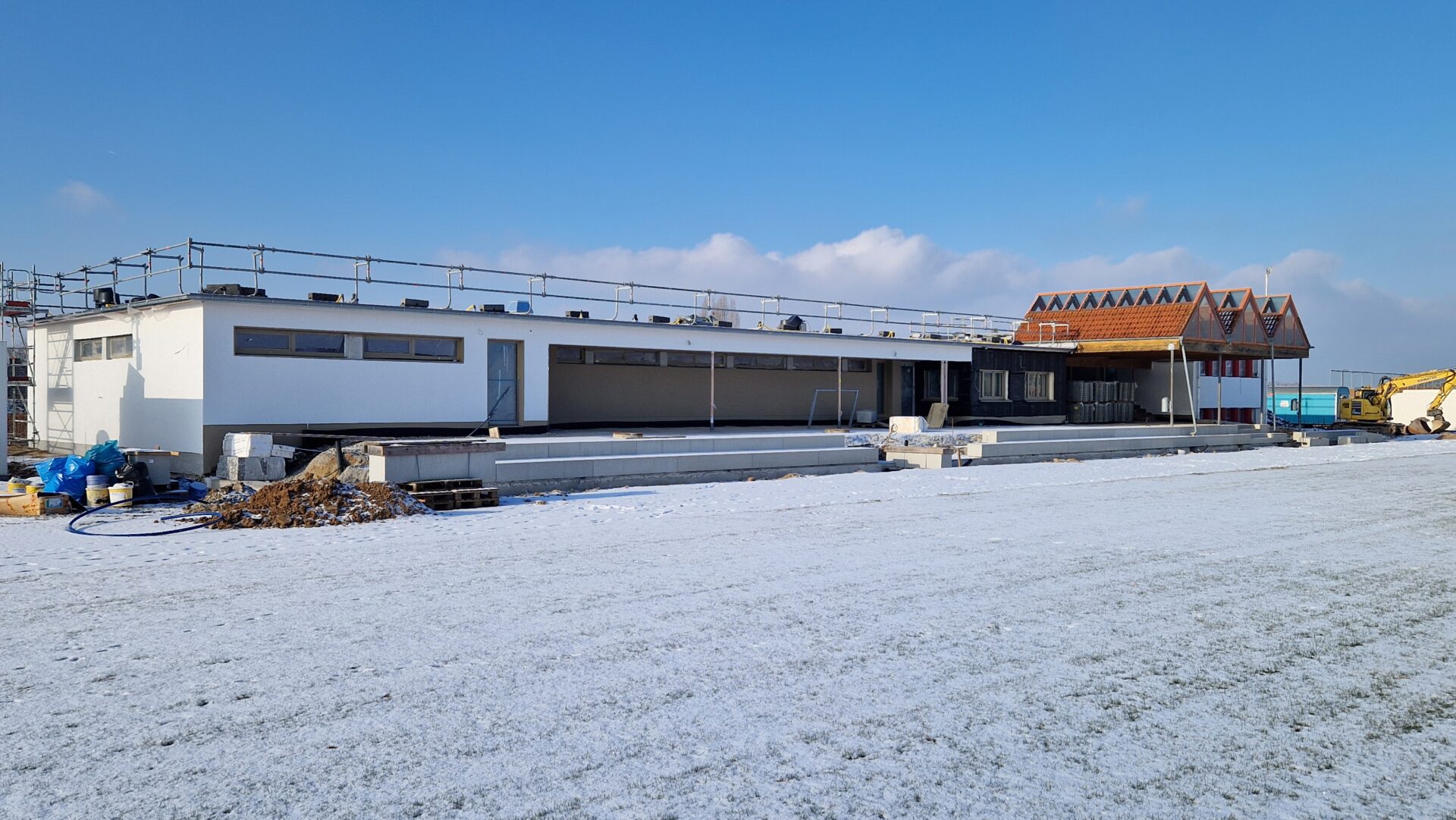 Lediglich die noch fehlende Holzverschalung sowie der Anstrich der Holzverkleidung an der östlichen Überdachung stehen noch aus und werden in den kommenden Bauabschnitten umgesetzt. Auch im Umfeld des Gebäudes sind erste wichtige Schritte erfolgt: Die neuen Treppen- und Sitzstufen zum A-Platz wurden bereits gesetzt und schaffen künftig eine funktionale und zugleich attraktive Verbindung zwischen Sportanlage und Gebäude.